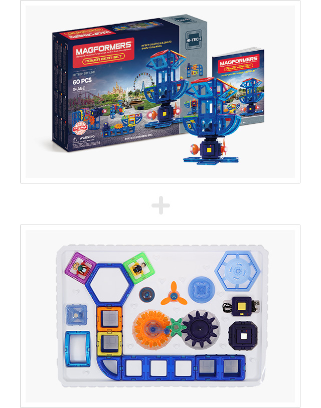 파워기어 세트는 3D기어, 파워블록, LED가 포함되어 톱니바퀴의 원리를 통해 스스로 움직이는 맥포머스 조형물의 제작이 가능한 세트입니다.
