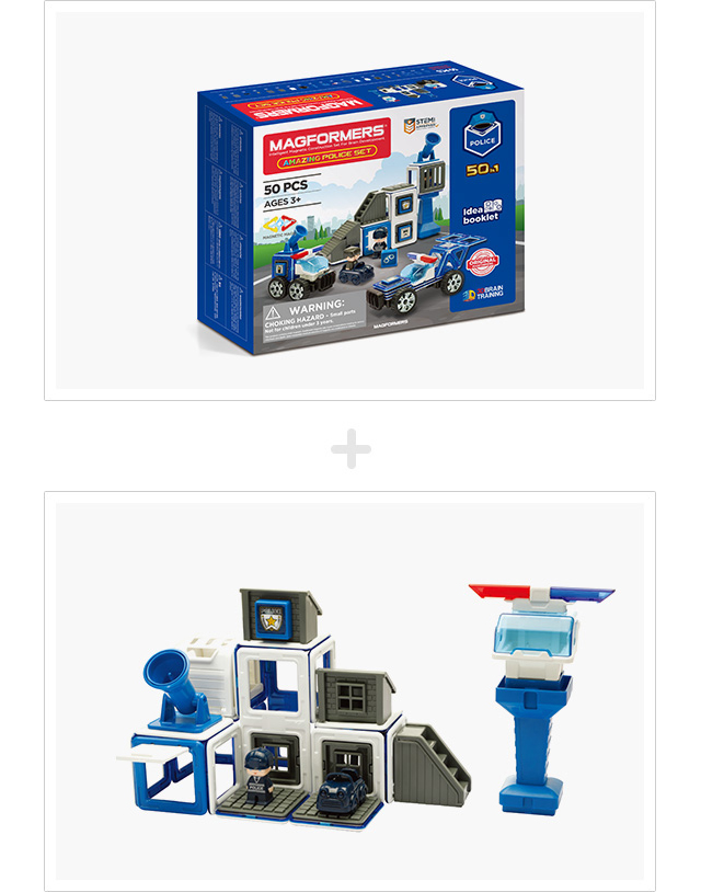 "맥포머스의 놀아운 변화! Amazing Police Set! 어메이징 폴리스 세트는 선호도가 높은 테마인 폴리스 컨셉과 맥포머스를 접목한 제품으로, 차뿐만 아니라, 경찰보트, 트럭, 버스, 경찰서 등 기존의 어떠한 맥포머스 테마 제품보다 디테일하고, 전문적인 폴리스 구성품 들을 만들어 볼 수 있습니다.