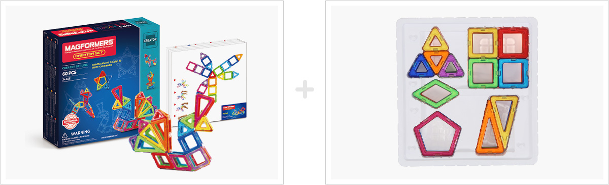 크리에이터 세트는 기본도형 6종을 활용해 평면도형이 입체도형으로 변신하는 과정을 6가지의 창의적인 조형 방법을 통해 알아보고, 대형 전개도를 활용해 입체도형의 전개도를 놀이를 통하여 자연스럽게 익힐 수 있는 세트입니다.