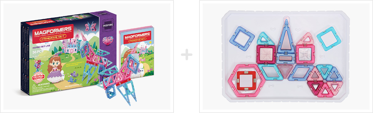 맥포머스 프린세스 세트는 여자아이들이 좋아하는 컬러톤의 맥포머스 피스와 LED LIGHTED BOX 가 함께 구성되어 있는 세트 입니다. 동화 속 공주님을 연상시키는 여러 가지 조형물을 만들어 보며 상상 속의 세계를 직접 만들어 보세요