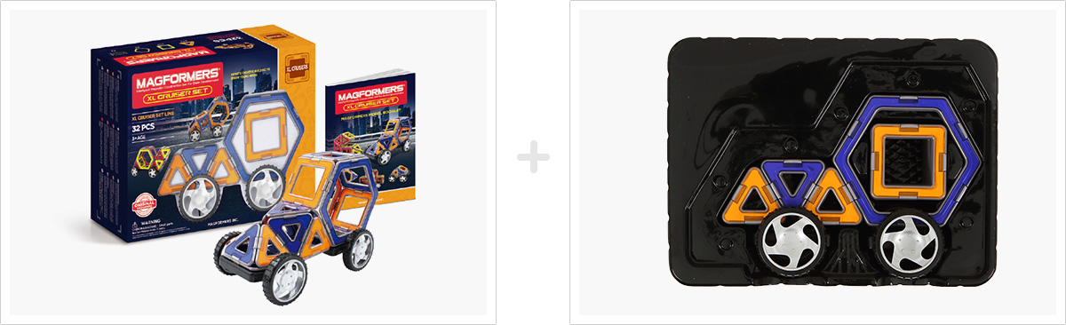 XL 크루저 세트는 기본 도형과 바퀴로 구성되어 있으며, 다양한 자동차를 만들 수 있는 세트입니다.