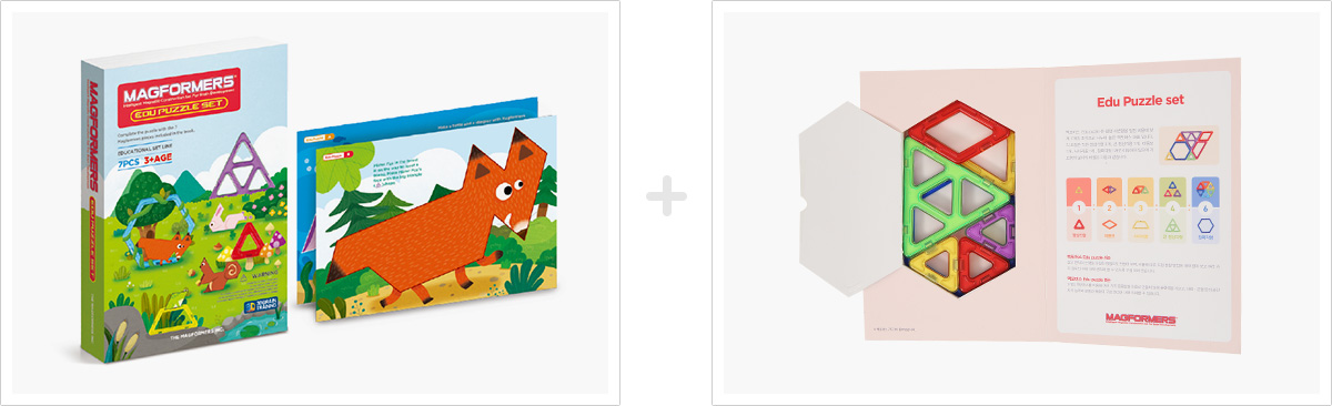 맥포머스 edu puzzle 은 평행 사변형을 일정 비율에 맞게 7개의 조각으로 나누어 놓은 맥포머스 퍼즐 입니다. 각 도형은 작은 정삼각형 3개 , 큰 정삼각형 1개, 마름모 1개 , 평행사변형 1개 , 정육각형 1개로 이루어져 있습니다.