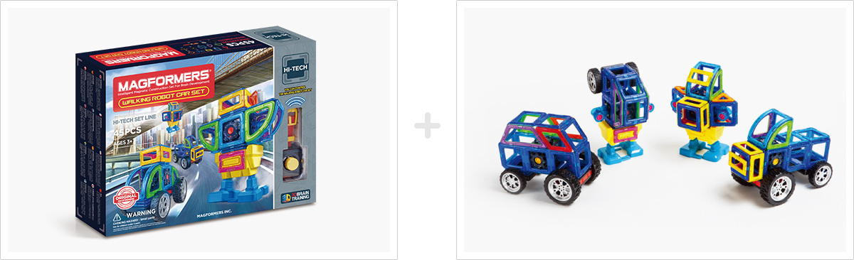맥포머스 워킹 로봇카 세트(Magformers Walking Robot Car Set)는 여러 가지 자석피스를 활용하여 아이들이 좋아하는 자동차와 로봇을 모두 만들어 볼 수 있는 세트입니다. 또한 가이드북에 나와 있는 순서대로 완성된 자동차를 로봇으로 변신시켜 보며 재미있는 조형활동을 해볼 수 있으며, 엔진워치를 가지고 자동차와 로봇을 조종해 볼 수도 있습니다. 다양한 액세서리와 자석피스를 가지고 나만의 자동차를 만들어 로봇으로 변신시켜 보세요. 나만의 조형물을 조종하는 재미와 함게 창의력도 자라납니다.
