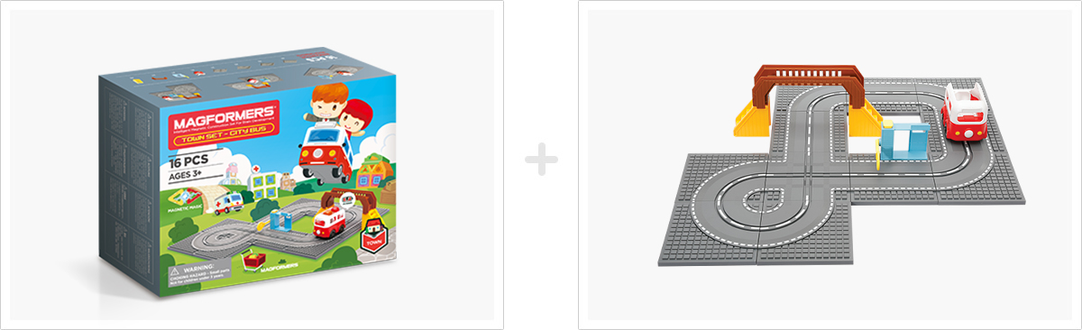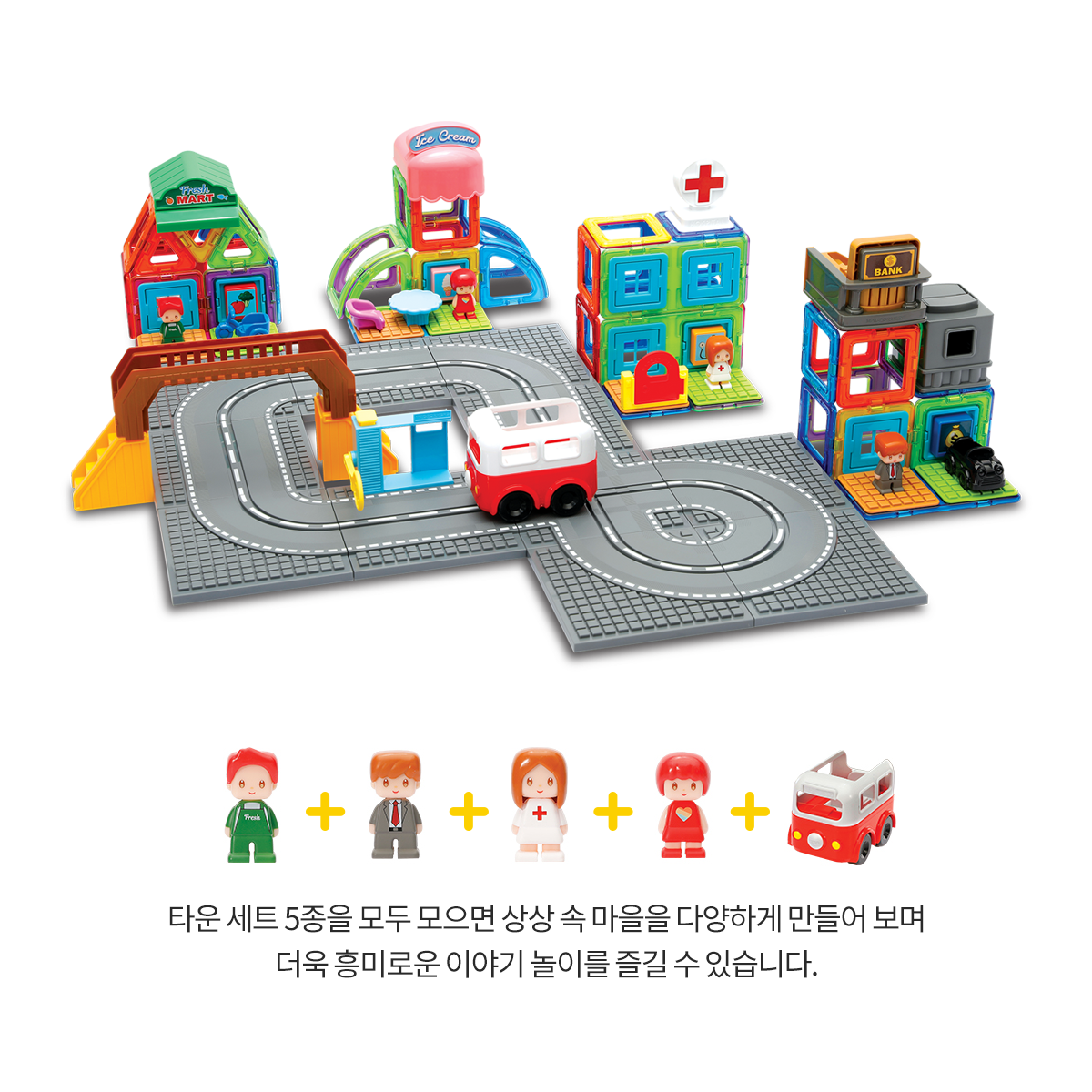 이 세트들은 총 5개의 세트(병원, 마트, 아이스크림 가게, 은행, 시티버스)로 출시 되었으며, 한 개씩 컬렉팅 할 때마다 마을을 완성할 수 있어 모으는 재미를 느낄 수 있는 맥포머스 제품입니다. 시티버스 세트의 경우 건전지를 넣으면 시티버스가 마을을 돌아다닐 수 있습니다. 5개의 타운 세트들을 모아 맥포머스 타운을 완성해 보세요!