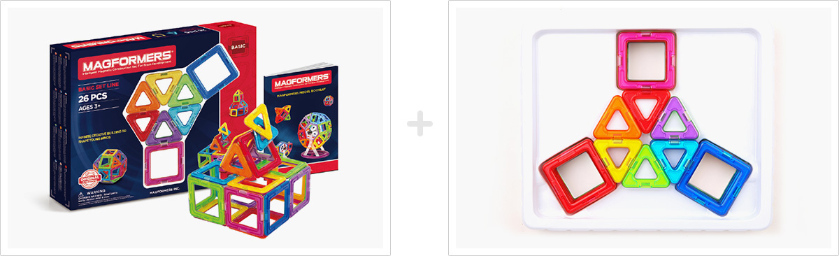맥포머스 26은 영아를 위한 소근육 발달에 도움이 되는 입문용 세트로서 간단한 평면도형과 입체도형을 만들 수 있습니다.