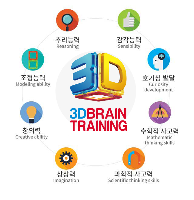 맥포머스 3D두뇌트레이닝은 조형능력, 추리능력, 감각능력, 호기심, 창의력, 상상력, 수학적 사고력, 과학적 사고력 등 8가지 필수 지능 능력들이 한 쪽으로 편향되지 않고 유기적으로 연결되어 균형 있게 발달한 3D두뇌로 만들어 줍니다.